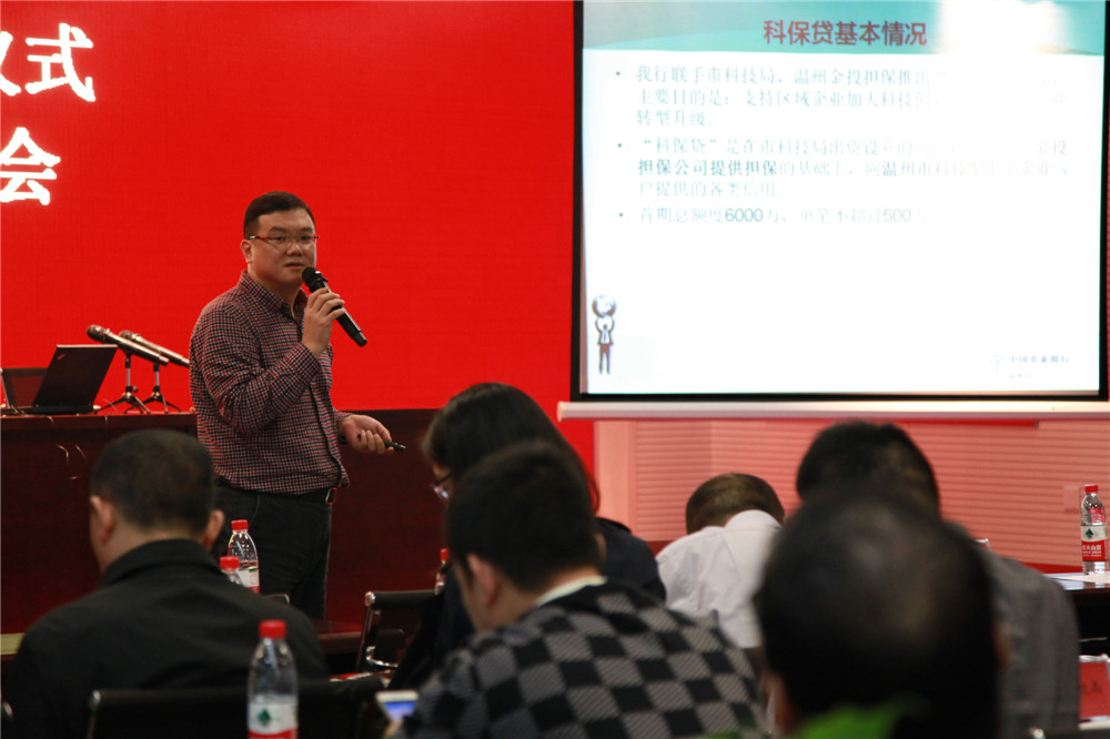 中國(guó)農(nóng)業(yè)銀行溫州分行公司部總經(jīng)理潘來青介紹“科保貸”產(chǎn)品