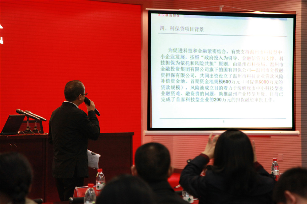 溫州市金投融資擔(dān)保有限公司董事長(zhǎng)林小春講解“科保貸”相關(guān)業(yè)務(wù)
