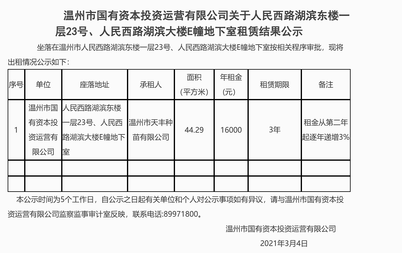 溫州市國(guó)有資本投資運(yùn)營(yíng)有限公司關(guān)于人民西路湖濱東樓一層23號(hào)、人民西路湖濱大樓E幢地下室租賃結(jié)果公示