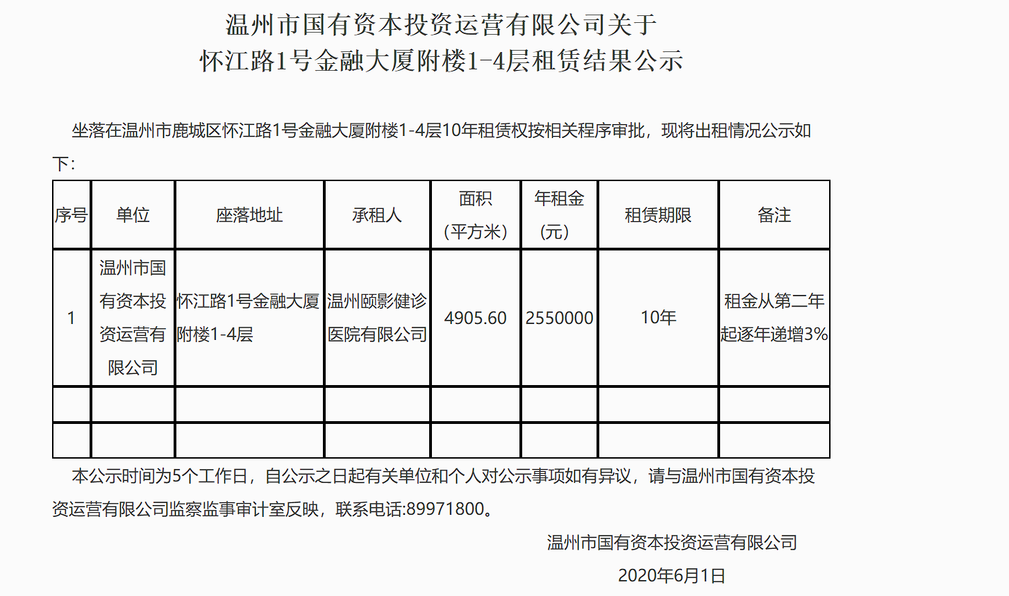 溫州市國(guó)有資本投資運(yùn)營(yíng)有限公司關(guān)于懷江路1號(hào)金融大廈附樓1-4層租賃結(jié)果公示