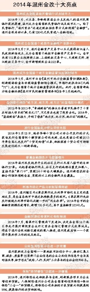 ??? 2014年是溫州金改的深化之年,創(chuàng)新突破不斷,在全國(guó)范圍內(nèi)率先探索和建立地方金融監(jiān)管體制,持續(xù)推進(jìn)民間融資走陽(yáng)光化、規(guī)范化之路。2014年7月,以正泰、華峰兩家溫企為主發(fā)起人的溫州民商銀行獲批籌建,溫州成為全國(guó)首批民營(yíng)銀行試點(diǎn)城市之一。